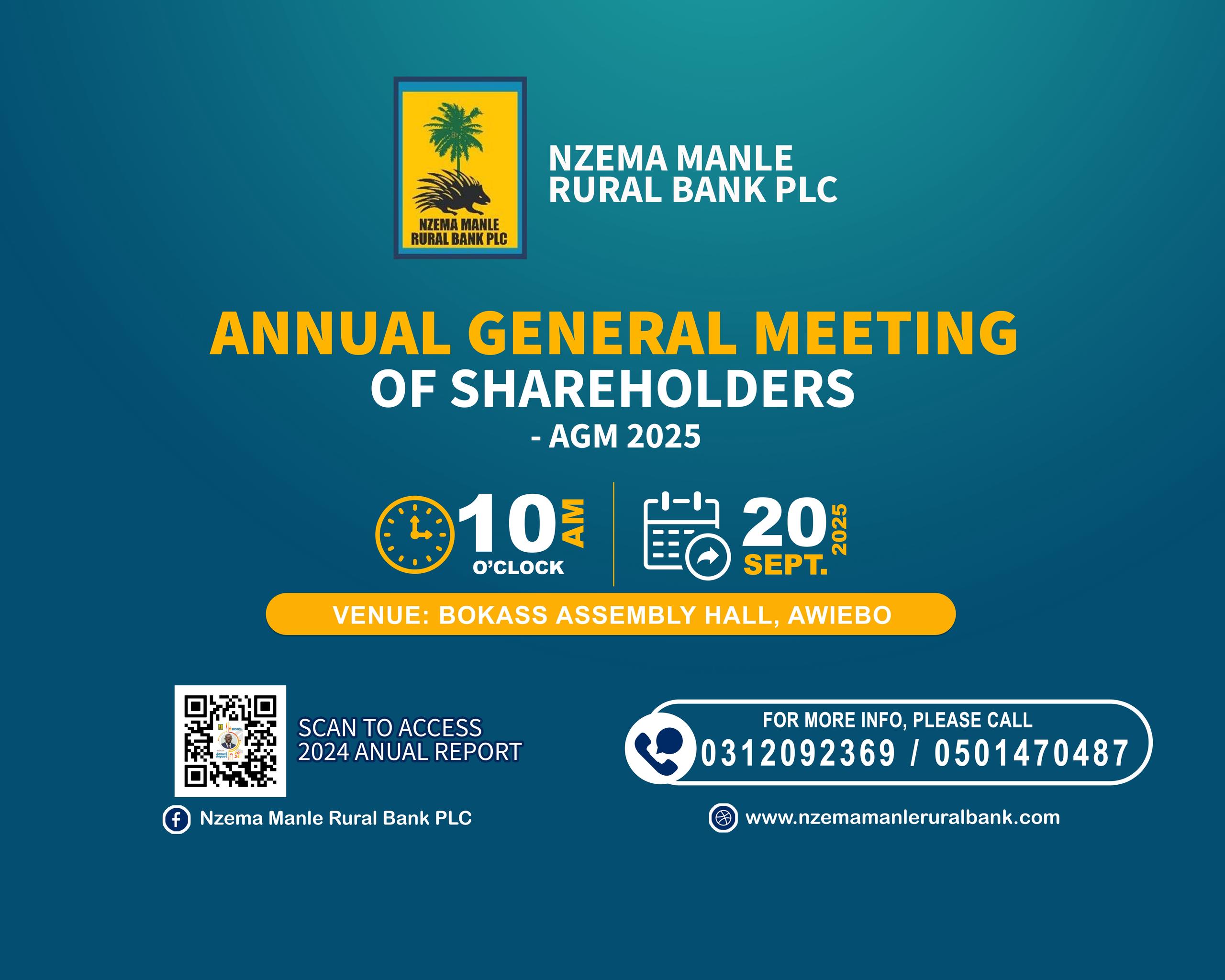 NZEMA MANLE RURAL BANK PLC will be held on Saturday, 20th September, 2025 at the Bonzo